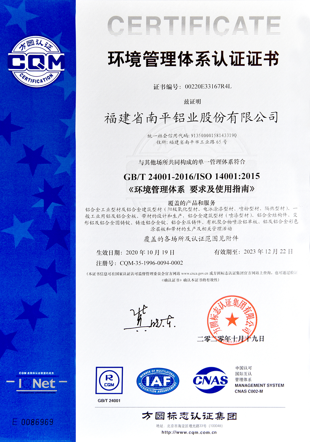環(huán)境管理體系認證證書